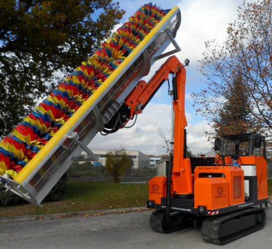 机器刷子臂由两节组成,被固定安装在可旋转塔台上,通过液压油缸和截止阀液压流量变化来实现各节刷臂活动。五轮液压驱动引擎搭配液压锁死装置,使刷子臂180度旋转。